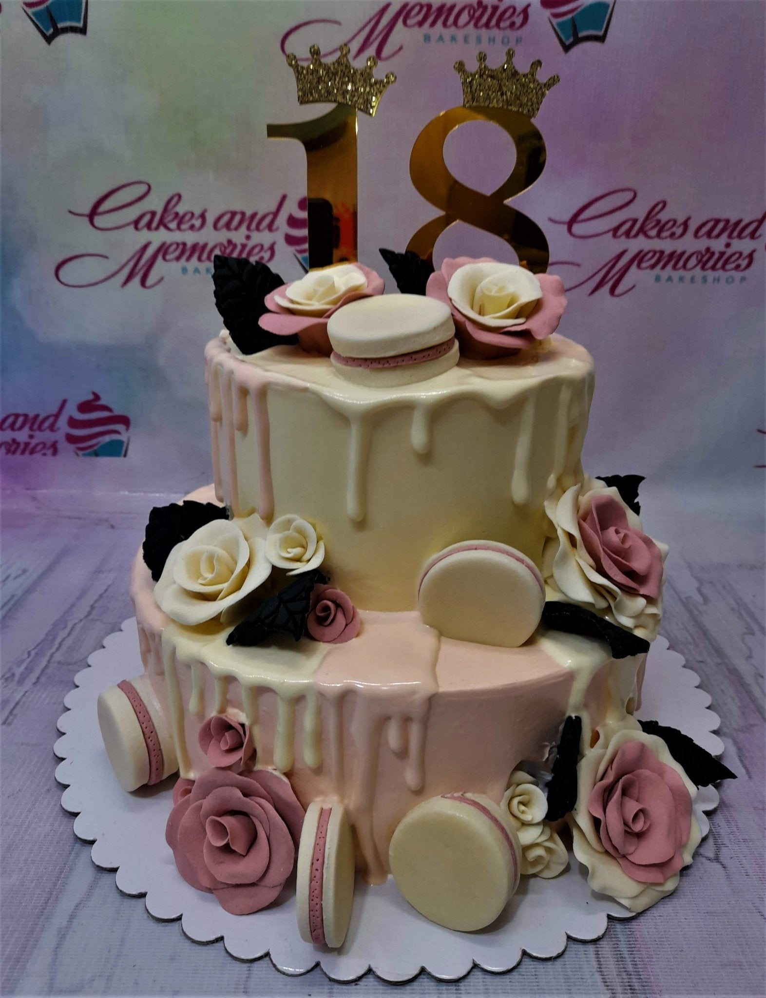 Two-tier pink and white drip cake decorated with pink and white fondant roses, macarons, and a gold number 18 topper with crowns.