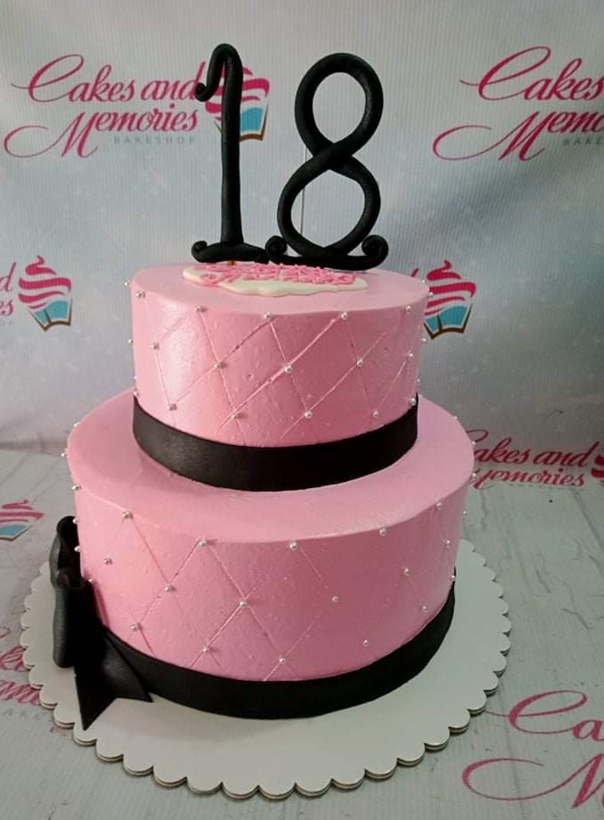 Elegant pink 2-tier birthday cake with quilted icing pattern, white pearls, black ribbons, and a large black number 18 topper.