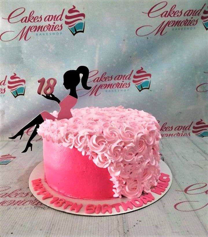 Hot pink and light pink 18th birthday cake with a silhouette girl topper and icing rosettes.