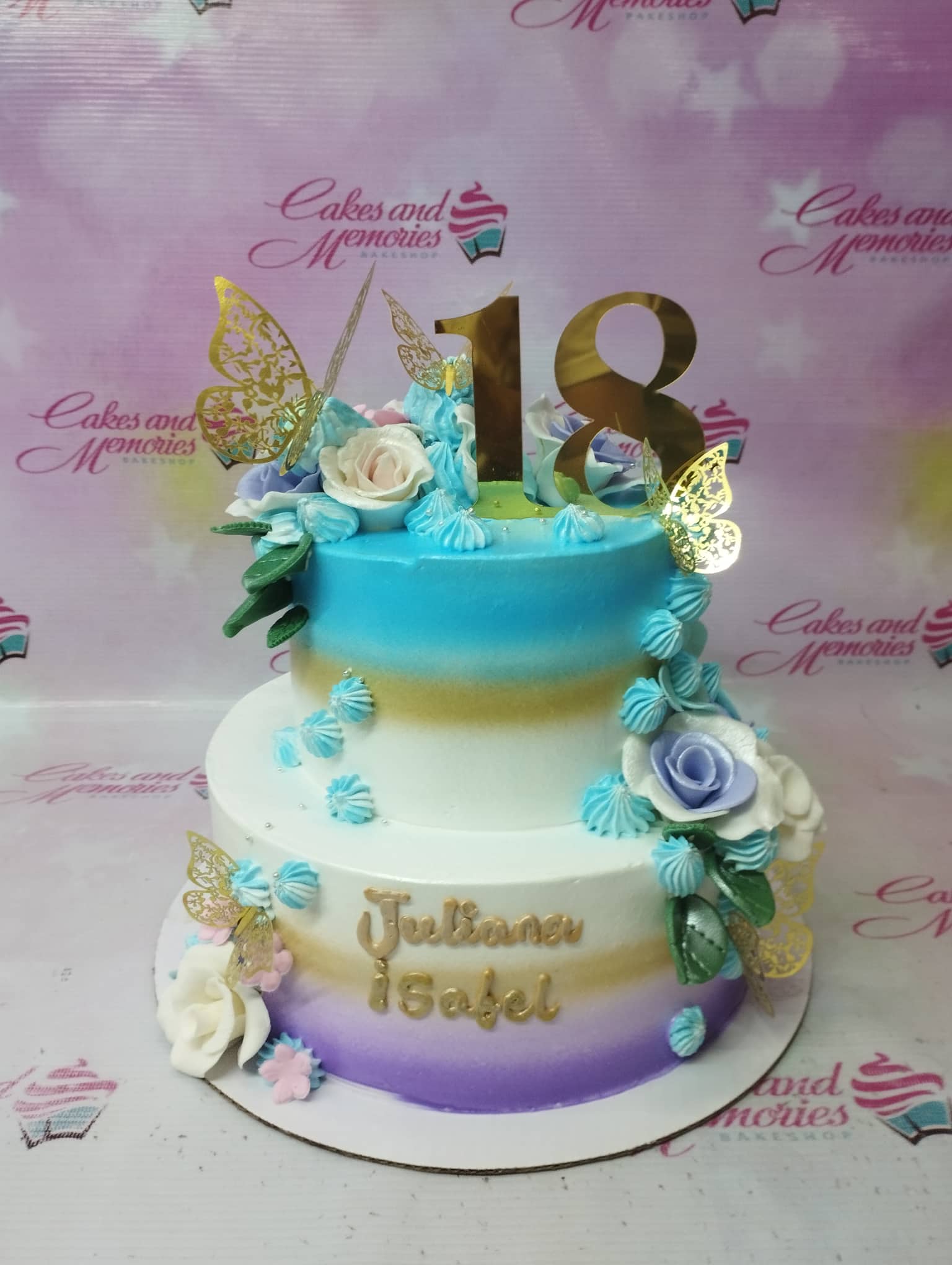 Two-tier birthday cake with blue, white, and purple gradient icing, gold 18 topper, and edible flowers.