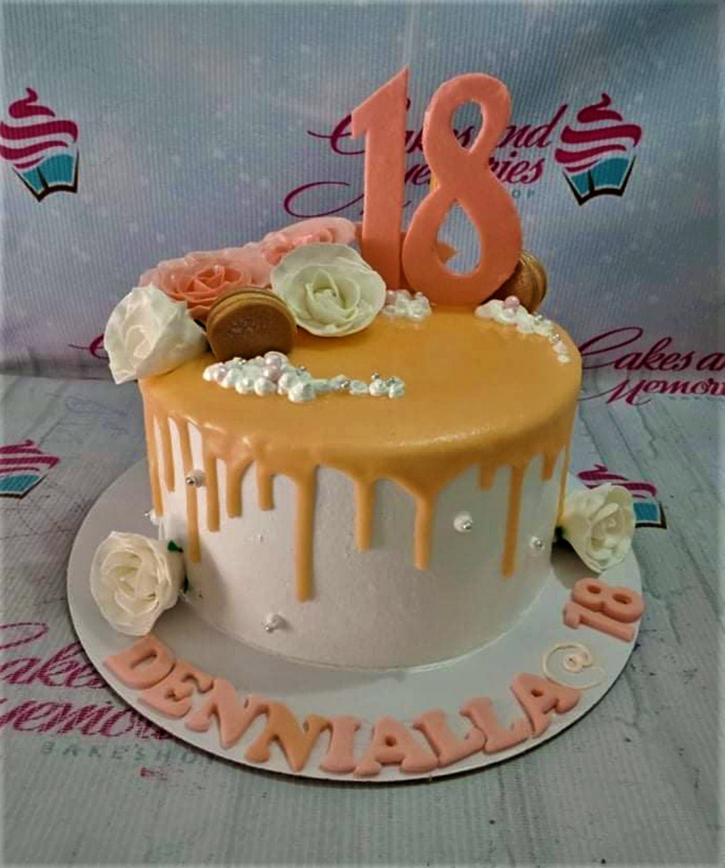 White 18th birthday cake with peach drip, edible roses, macarons, and large peach number 18 topper.