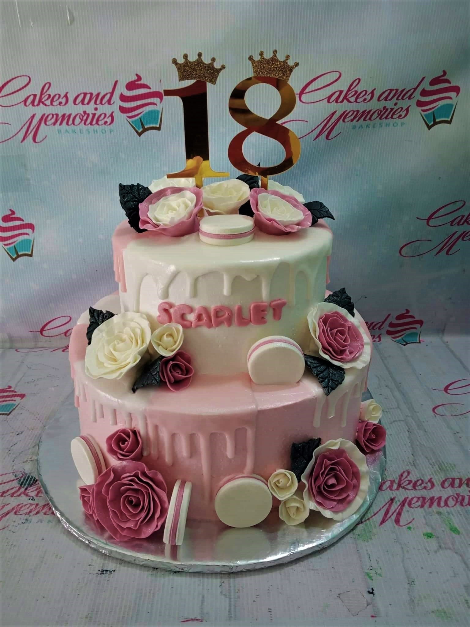 Two-tier pink and white drip cake for an 18th birthday with pink roses, white macarons, and a gold number 18 topper.