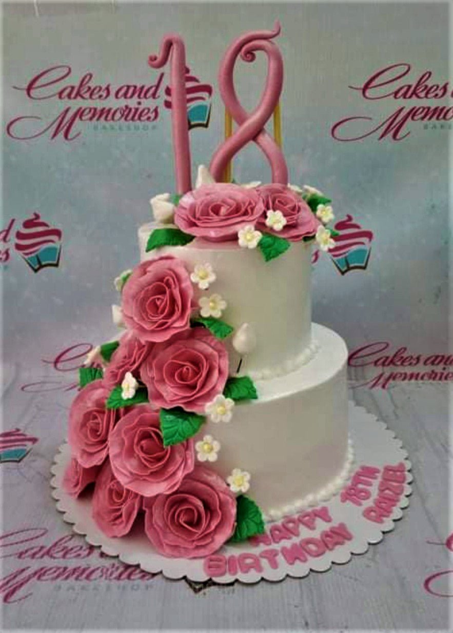 White 2-tier birthday cake with pink gumpaste roses and a large pink number 18 topper.