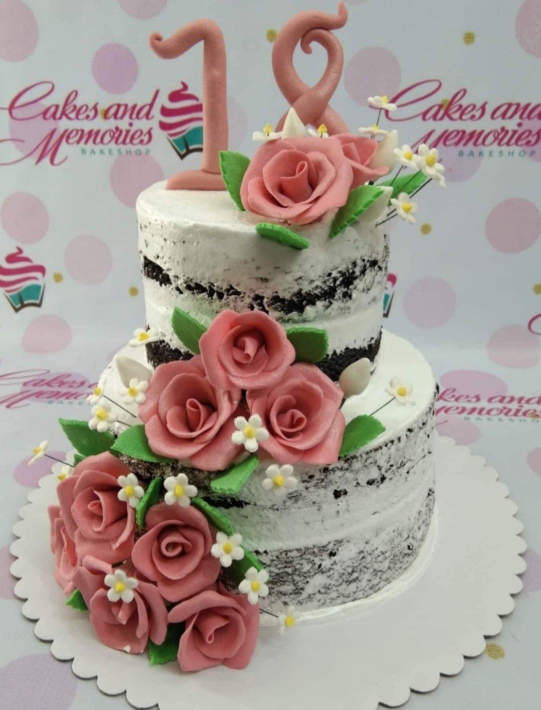 Two-tier semi-naked chocolate cake with pink gumpaste roses, white filler flowers, and a pink number 18 topper.