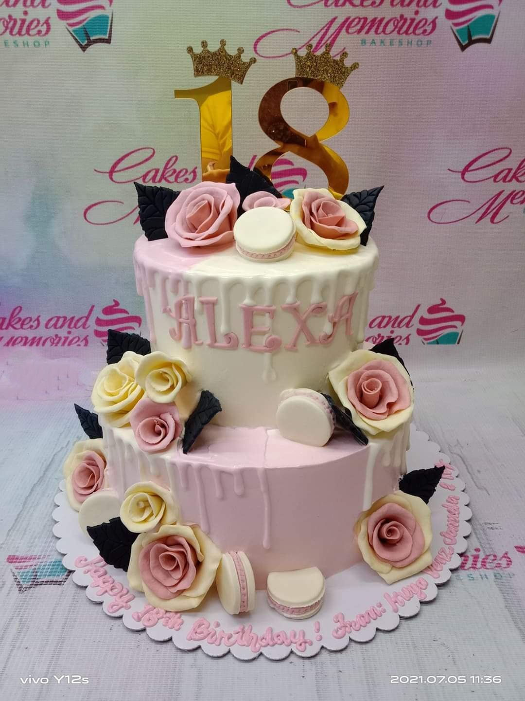 Two-tier pink and white drip cake for an 18th birthday featuring edible roses, macarons, and a gold number 18 crown topper.