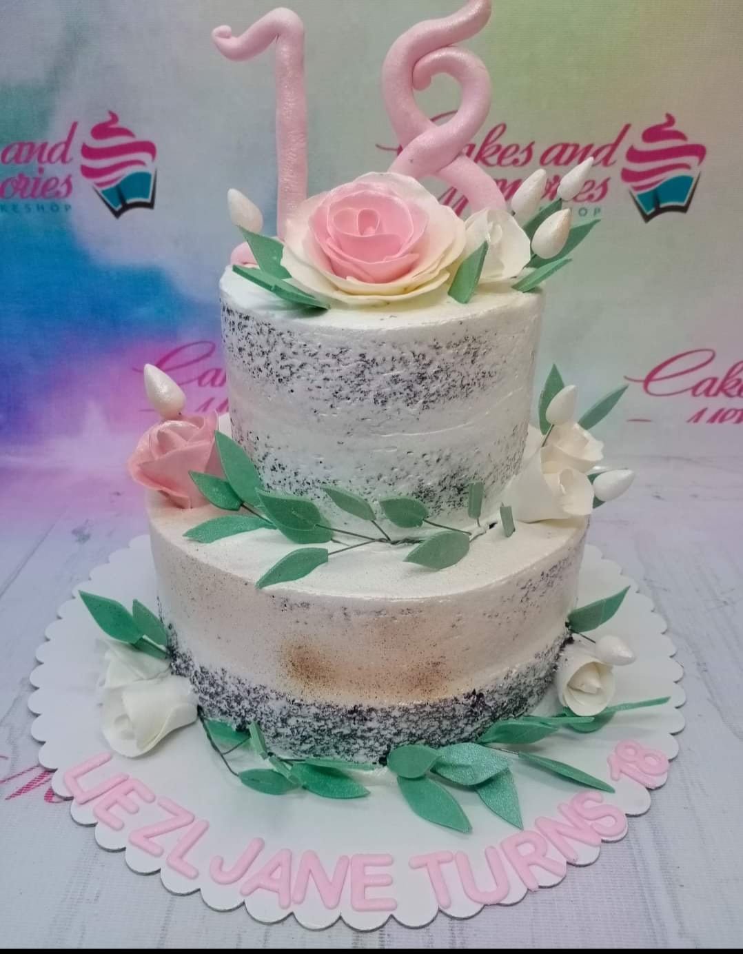Two-tier semi-naked chocolate cake with pink and white edible roses, green leaves, and a pink number 18 topper for a debut celebration.