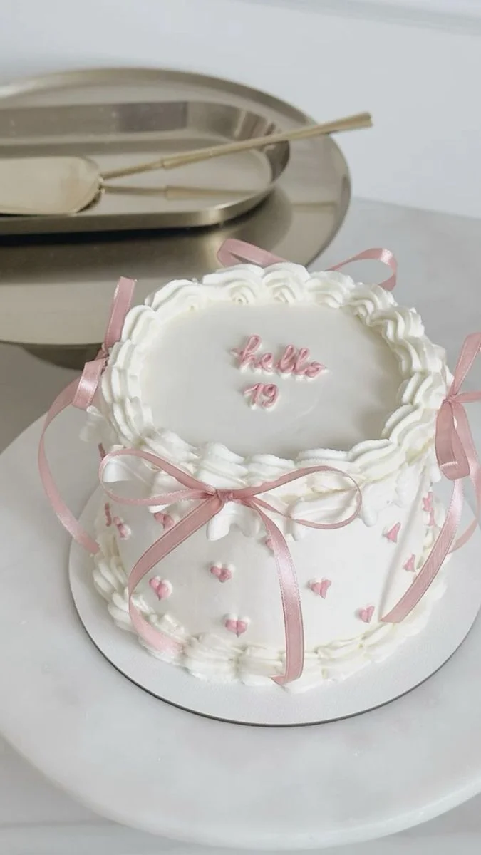 White minimalist cake with pink piped hearts, satin ribbons, and 'hello 19' message in pink icing.