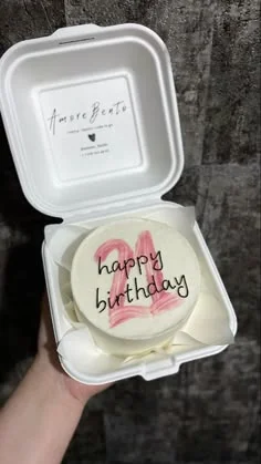 White bento cake in a square box with a pink number 21 and black happy birthday icing text.