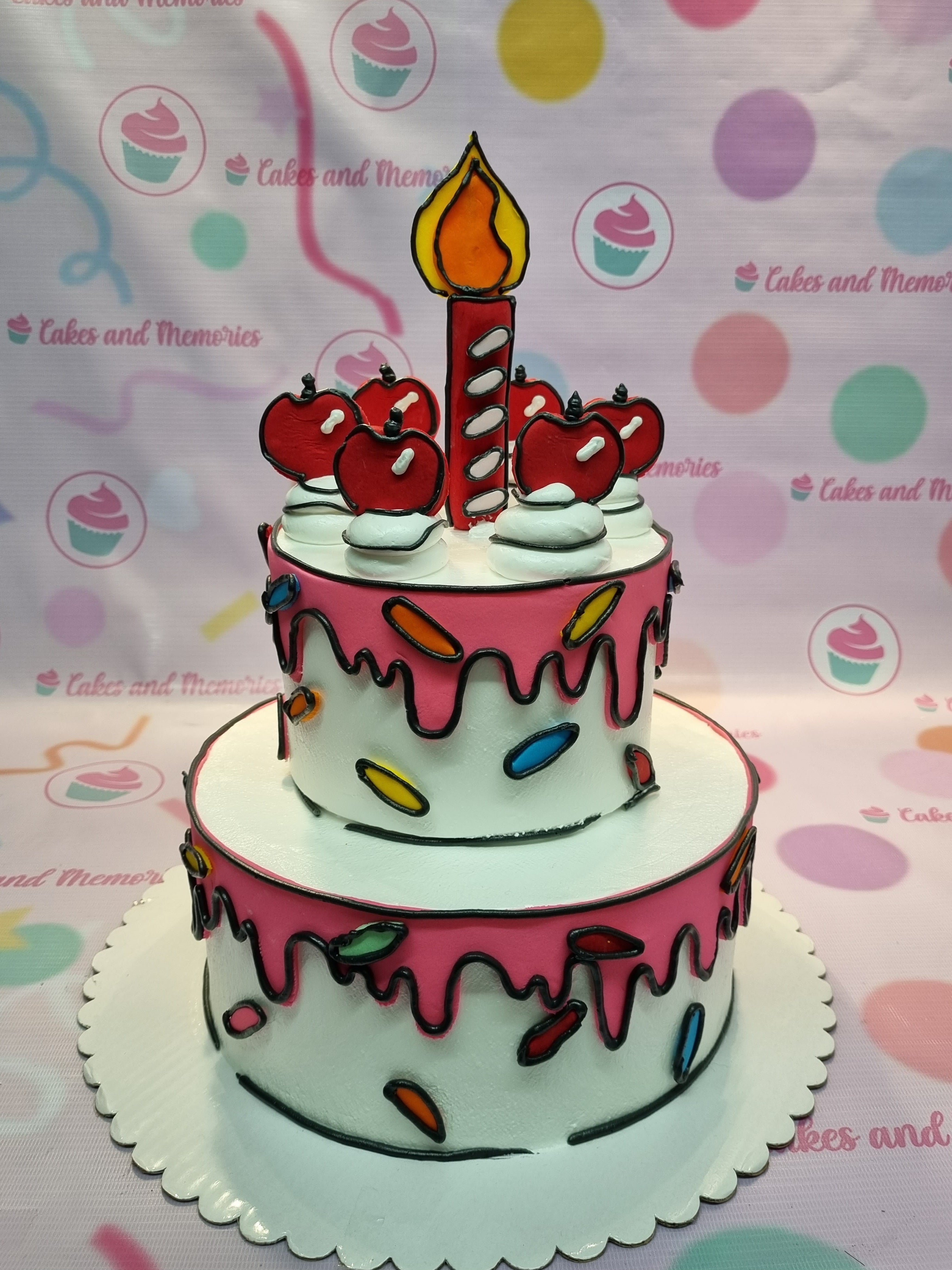 Two-tier 2D comic style cake with pink dripping icing, red apple toppers, and a large red candle topper.
