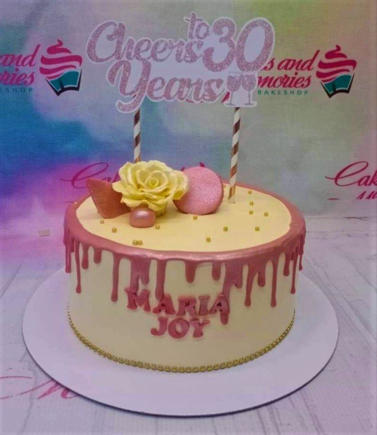 Cream colored 1-tier cake with rose gold drip, a yellow rose, pink macaron, and a Cheers to 30 Years topper.