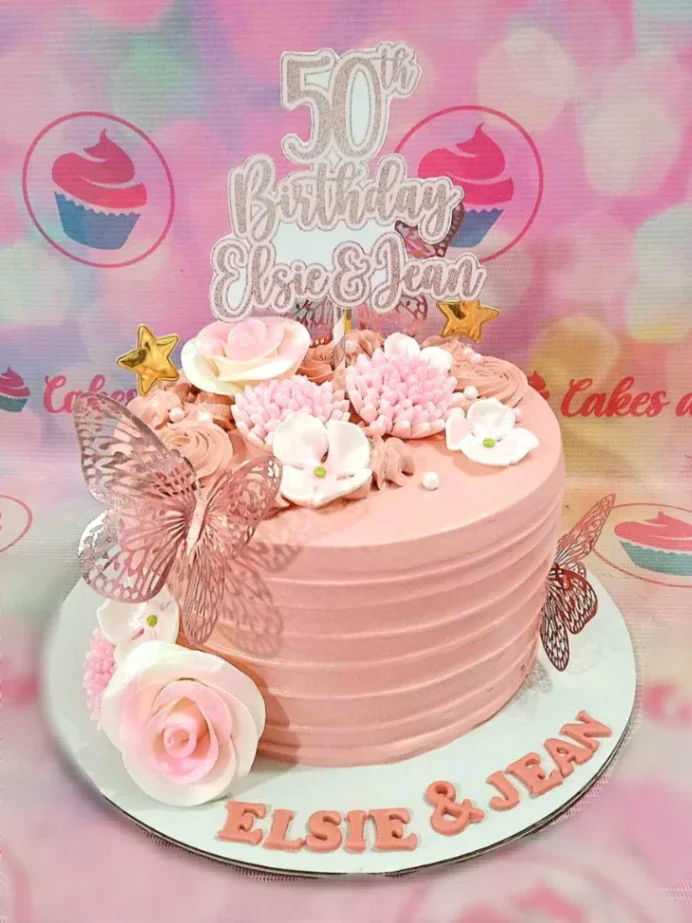 Pink 50th birthday cake for Elsie and Jean featuring pink icing ridges, edible flowers, and rose gold butterfly toppers.