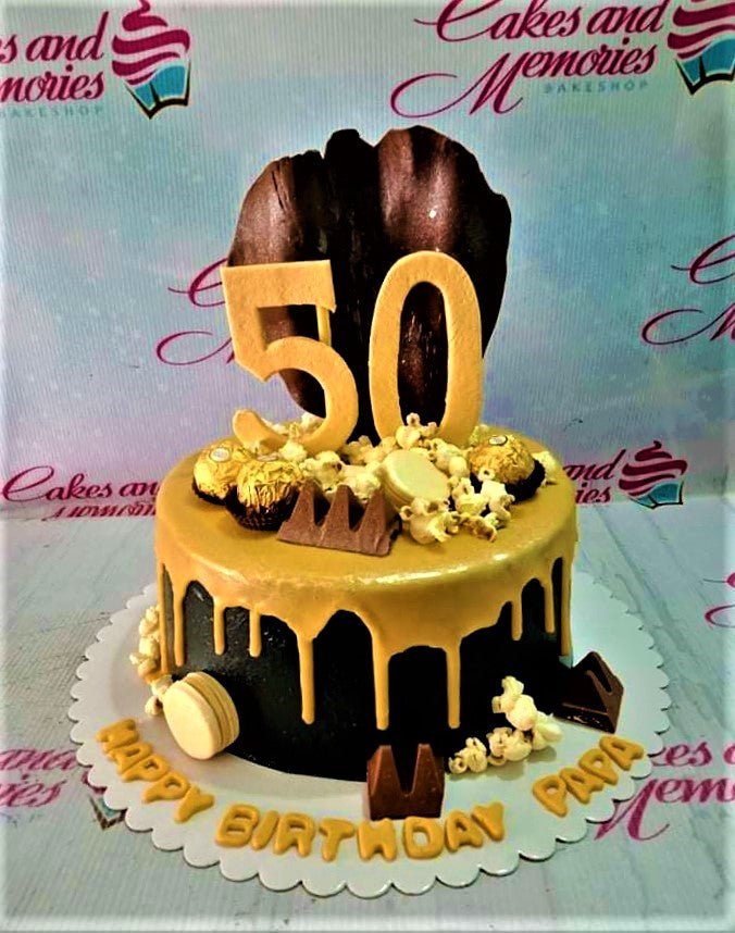 Black 50th birthday cake with gold drip, Ferrero Rocher, popcorn, and chocolate accents for Papa.