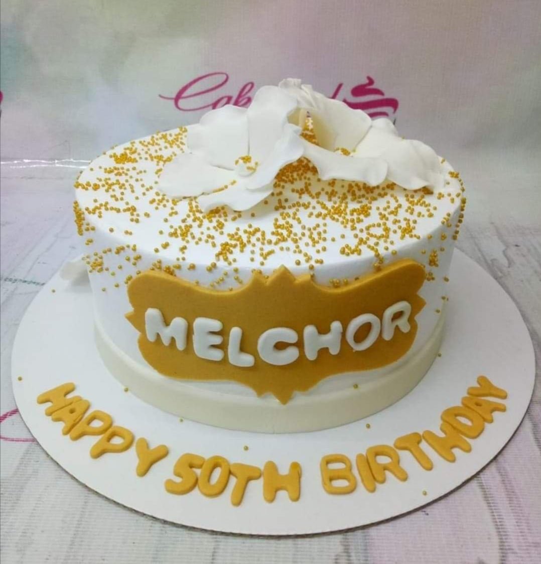 White 1-tier birthday cake with gold sprinkles, white gumpaste flowers, and a gold name plaque for Melchor's 50th birthday.