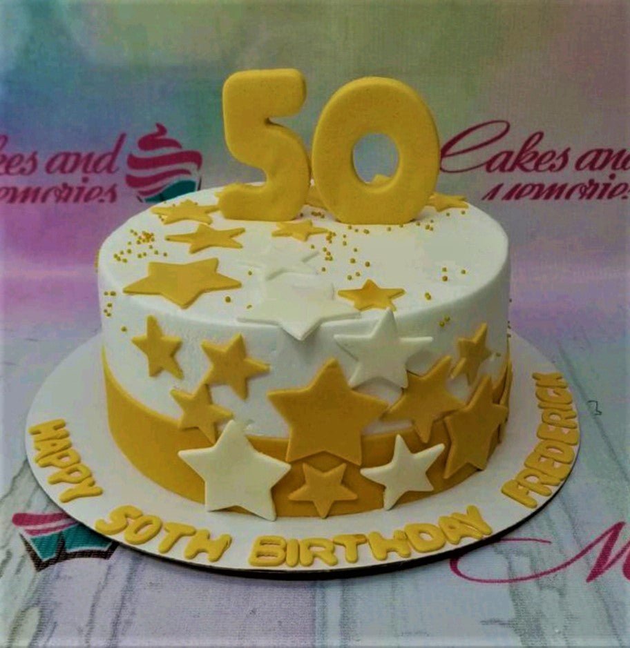 White and yellow 50th birthday cake with yellow and white fondant stars and a large yellow number 50 topper.