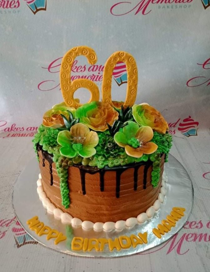 Chocolate brown cake with green icing succulents, yellow edible flowers, and a large gold number 60 topper for a 60th birthday celebration.