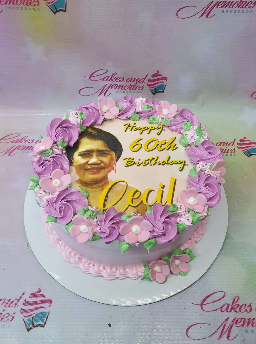 Round birthday cake with a photo print of a woman, purple icing rosettes, pink fondant flowers, and yellow icing text.