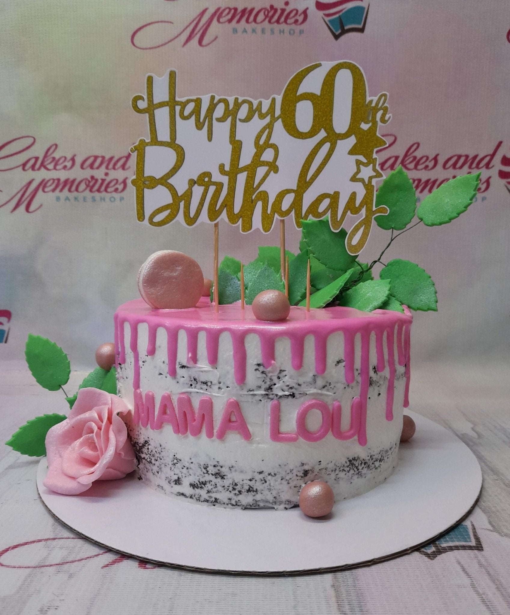 White semi-naked cake with pink drip, a large pink fondant rose, green leaves, and a gold glitter Happy 60th Birthday topper.