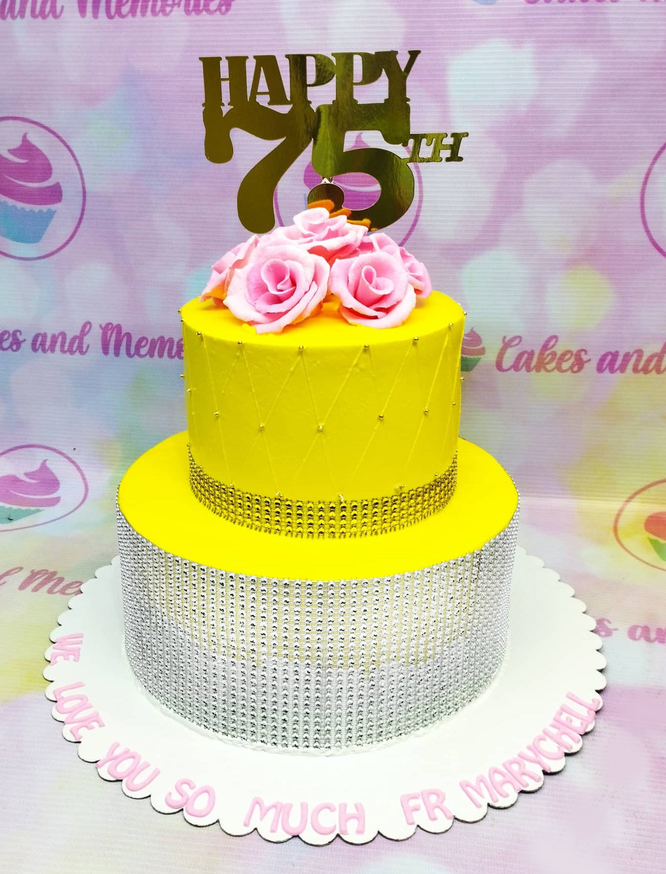 Yellow 2-tier 75th birthday cake with pink fondant roses, gold number topper, and silver rhinestone-style wrap on the bottom tier.