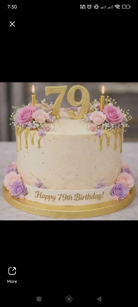 Elegant 79th birthday cake with ivory icing, gold drip, pink and purple roses, and a large gold 79 topper.