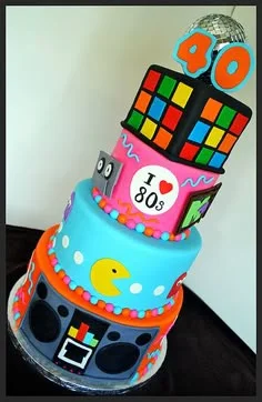 Vibrant 3-tier 80s themed birthday cake with Rubik's Cube top, Pac-Man, MTV logo, and a disco ball topper.