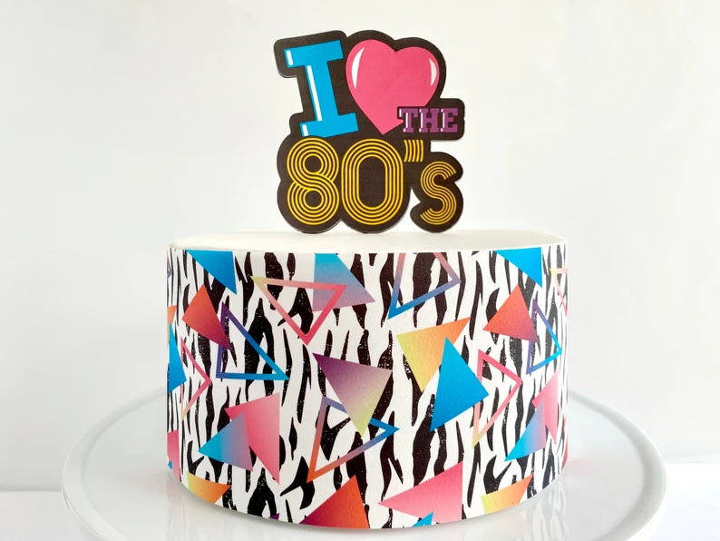 Retro 80s themed cake with zebra print sides, neon geometric triangles, and an I Love the 80s topper.
