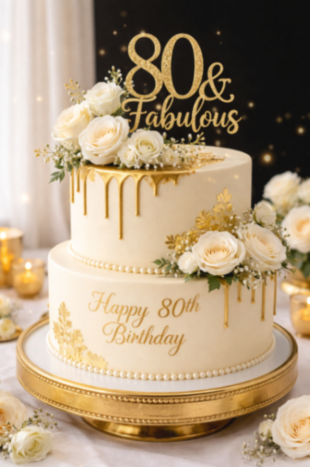 Elegant 2-tier ivory 80th birthday cake with gold drip, white roses, and a gold '80 & Fabulous' topper.