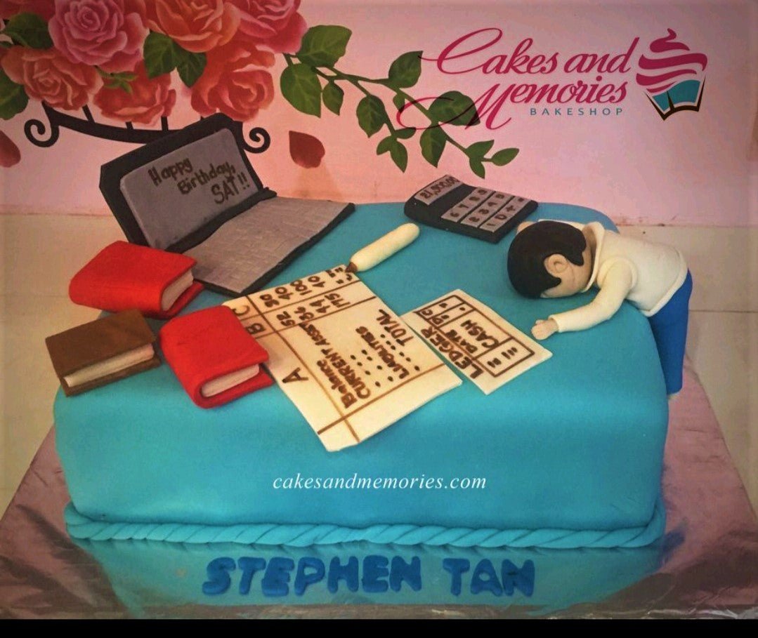 Blue square fondant cake for an accountant featuring a sleeping office worker figurine, laptop, calculator, and ledger documents.