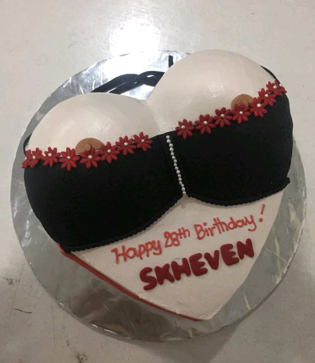 A heart-shaped fondant cake designed to look like a woman's torso wearing a black lace-textured bra with red flower accents.