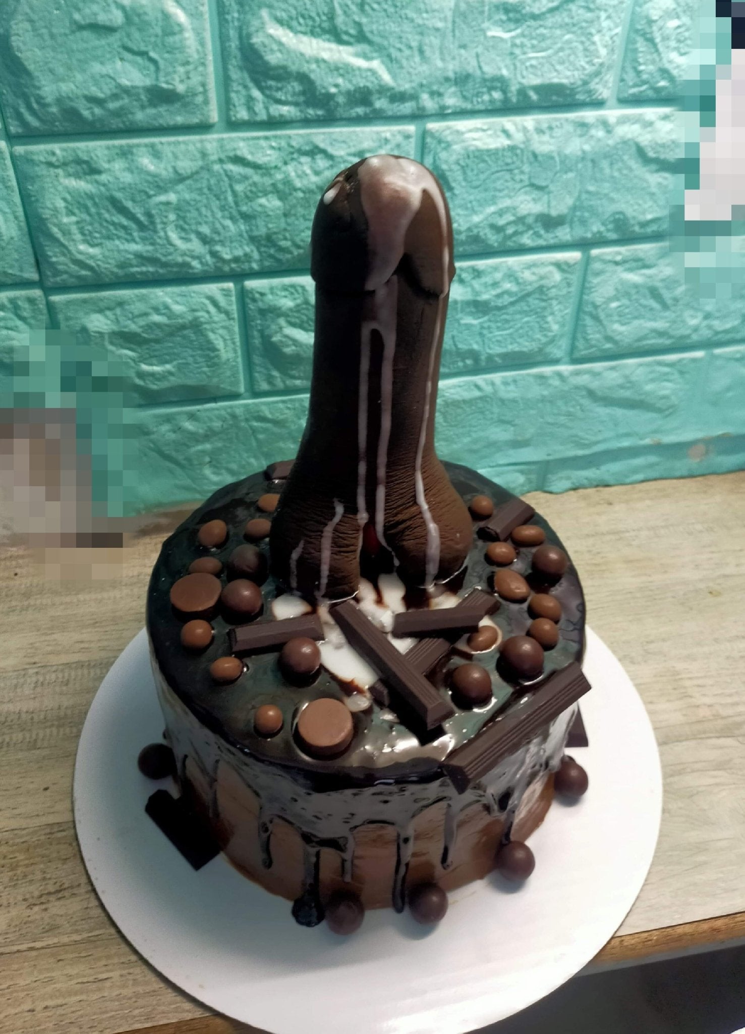 Chocolate drip cake with a large brown phallic-shaped fondant topper and chocolate bar decorations.