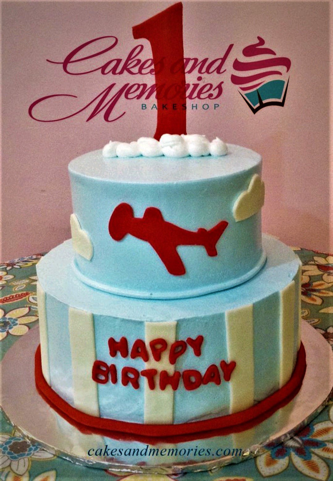 Two-tier light blue airplane themed birthday cake with red number one topper, white clouds, and red airplane silhouette.