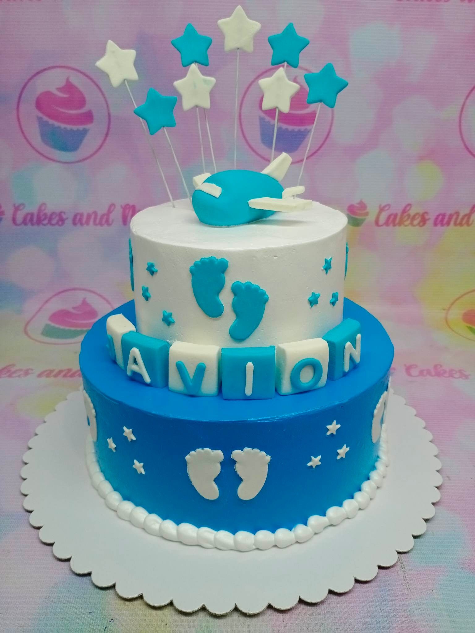 Two-tier blue and white airplane themed cake with fondant stars, baby footprints, and name blocks for Avion.