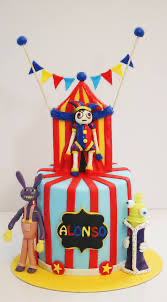 Two-tier circus themed cake with red and yellow stripes, featuring characters from The Amazing Digital Circus and a name plaque for Alonso.