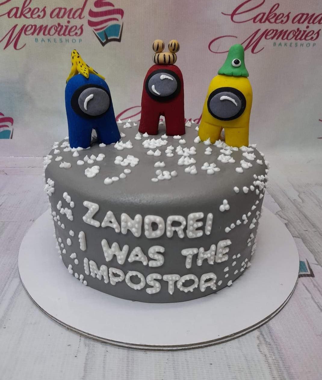 Gray Among Us themed birthday cake with blue, red, and yellow fondant crewmate figures and white icing dollops.