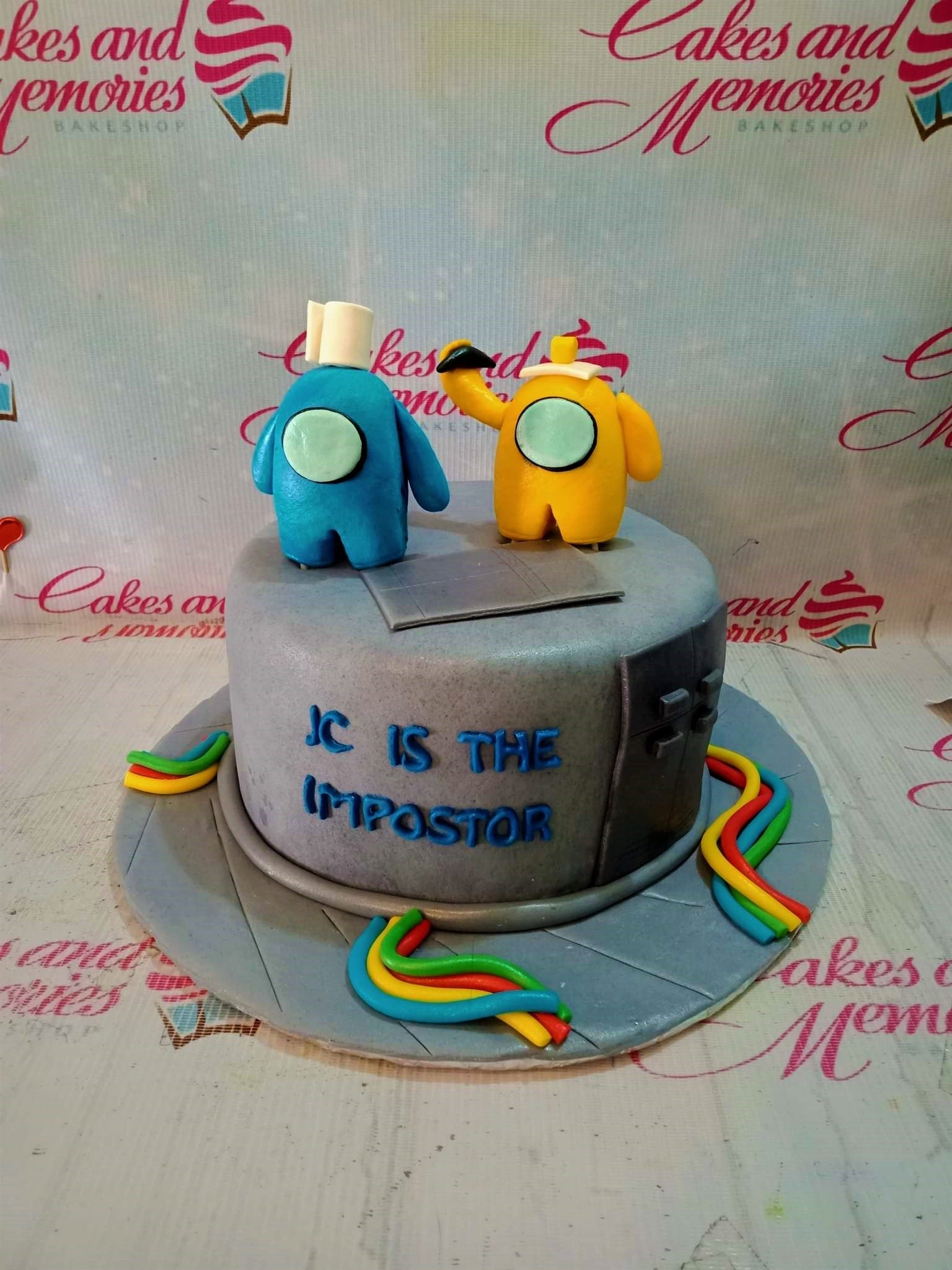 Among Us themed gray fondant cake with blue and yellow 3D characters and colorful wires on the base.