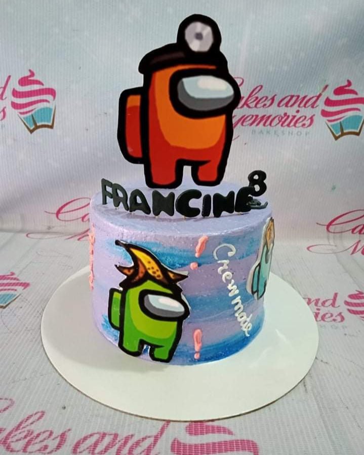Among Us themed birthday cake with purple and blue textured icing, featuring orange, green, and blue crewmate printouts.