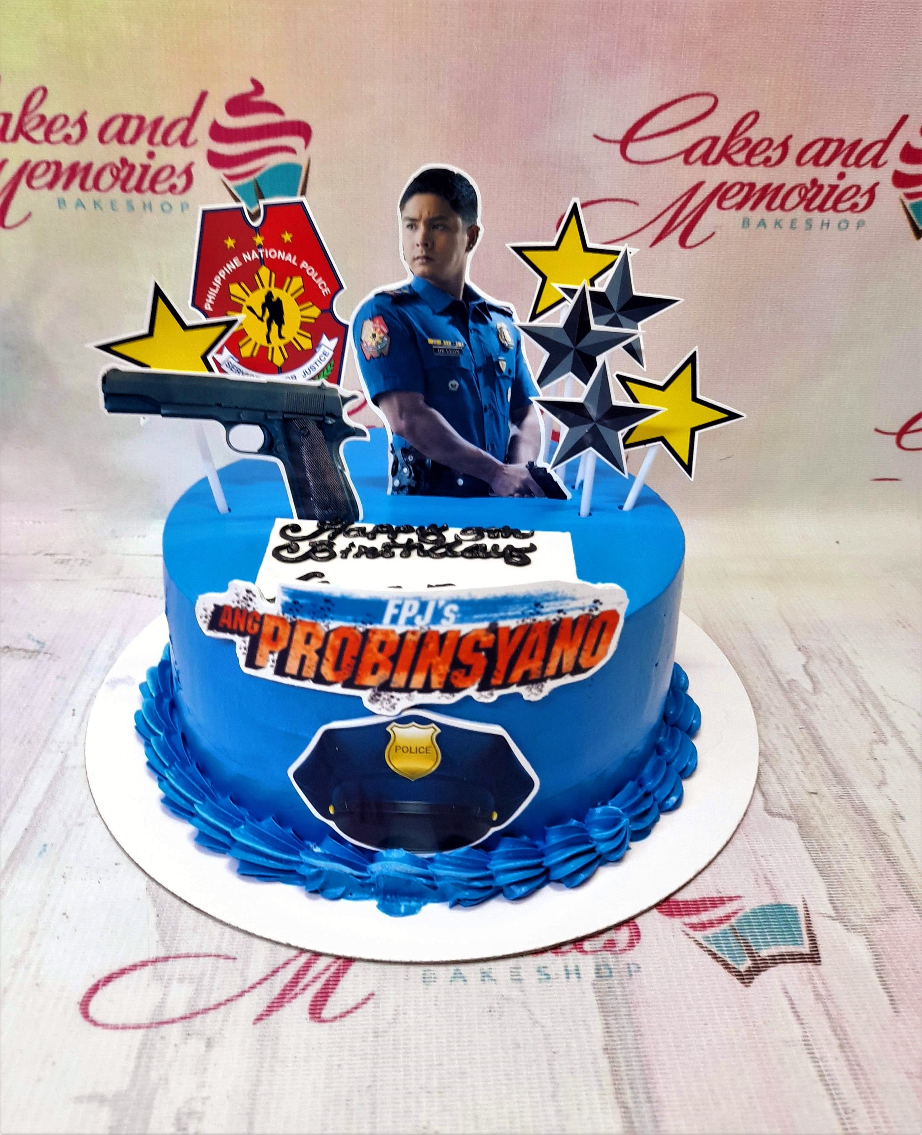 Blue police themed birthday cake featuring FPJ's Ang Probinsyano character and police badge decorations.