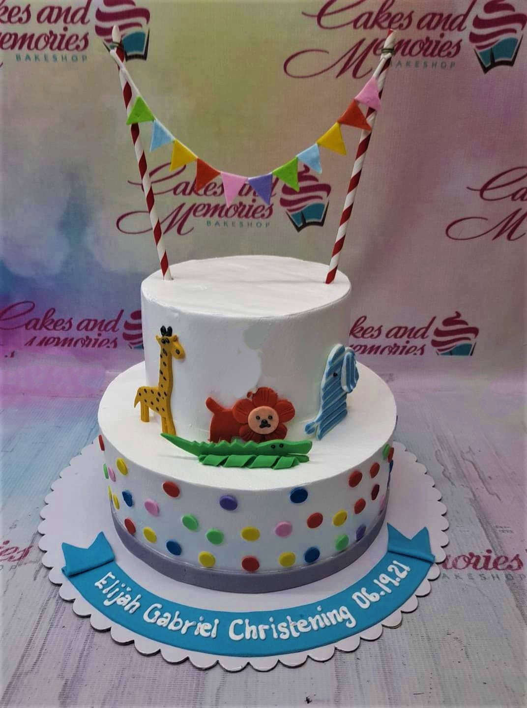 White 2-tier animal themed christening cake with fondant giraffe, lion, elephant, and crocodile figures and colorful polka dots.