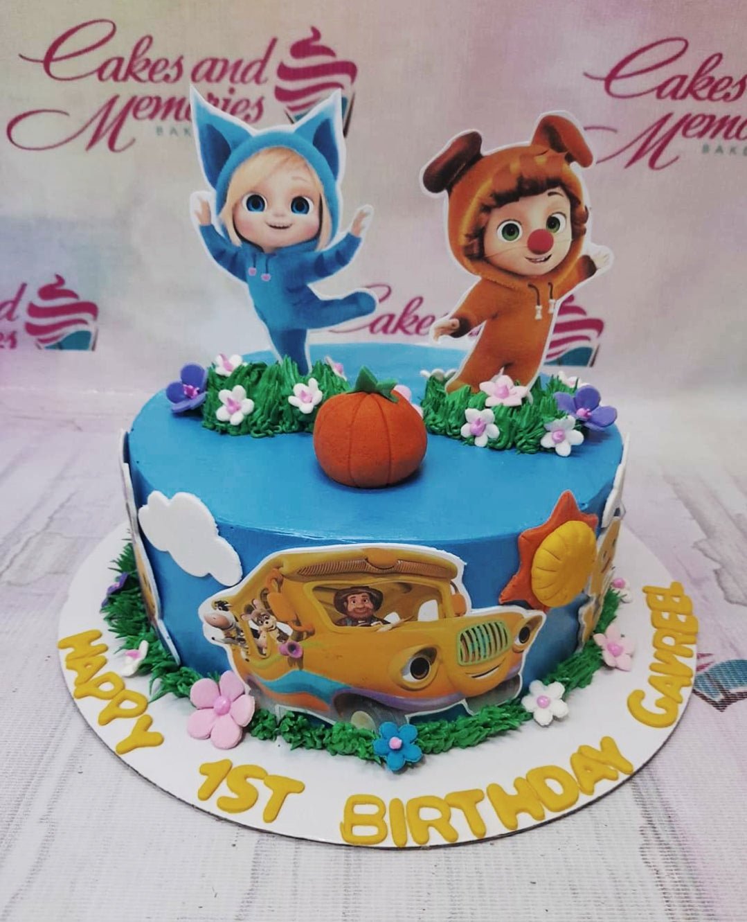 Blue 1-tier birthday cake with 3D animated character printouts, a fondant pumpkin, and grass icing decorations.