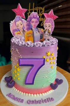 Purple and green gradient birthday cake with anime character printouts, a large purple number 7, and yellow stars.
