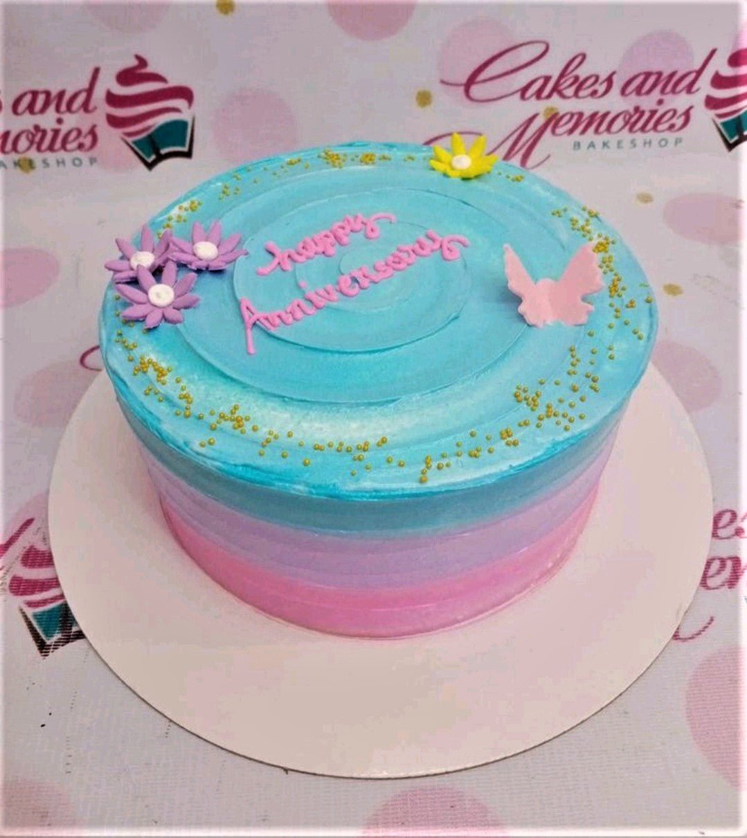Single tier round cake with blue, purple, and pink gradient icing, topped with purple flowers, a pink butterfly, and gold sprinkles.