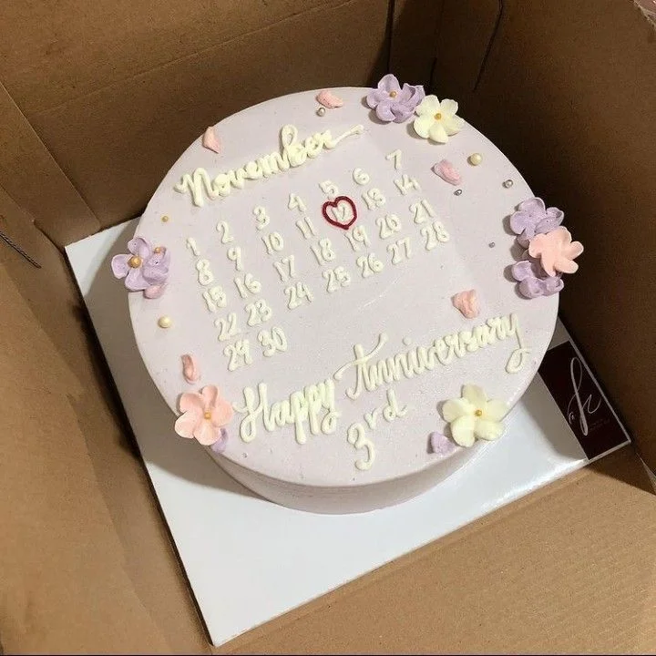 Lavender bento cake with a hand-piped November calendar design, pink and purple icing flowers, and a Happy Anniversary message.