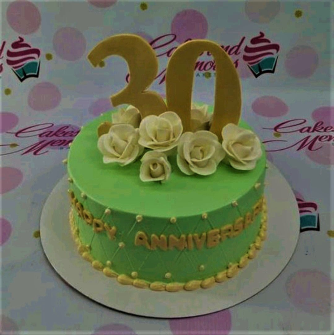 Celebrate a milestone with this elegant 1-tier green anniversary cake. The design features a smooth green soft-icing base decorated with a quilted pattern and delicate yellow icing dots. Beautiful white gumpaste roses are clustered on top, surrounding a large gold number 30 topper. The side of the cake displays a 'Happy Anniversary' message in gold gumpaste letters. This sophisticated design is perfect for honoring three decades of love and commitment. Order your custom anniversary cake today from Genie.ph for delivery in Cebu City, Mandaue, or Lapu-lapu City.