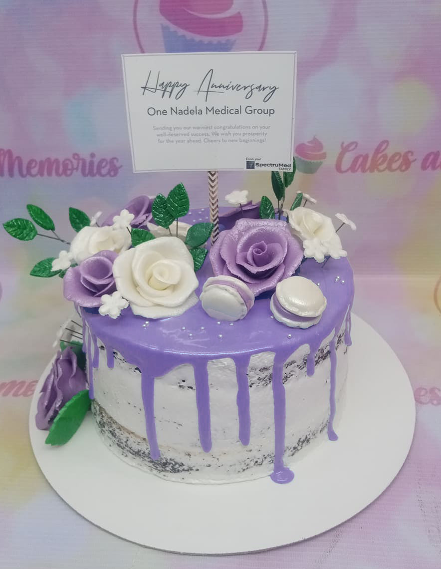 Semi-naked chocolate cake with purple icing drip, purple and white gumpaste roses, and a large anniversary message topper.