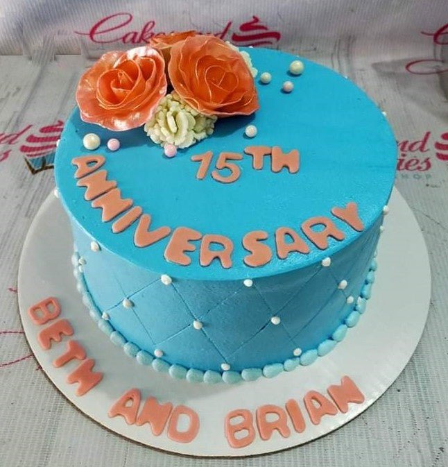 Light blue 15th anniversary cake with orange gumpaste roses, white pearls, and quilted side pattern with pink lettering.