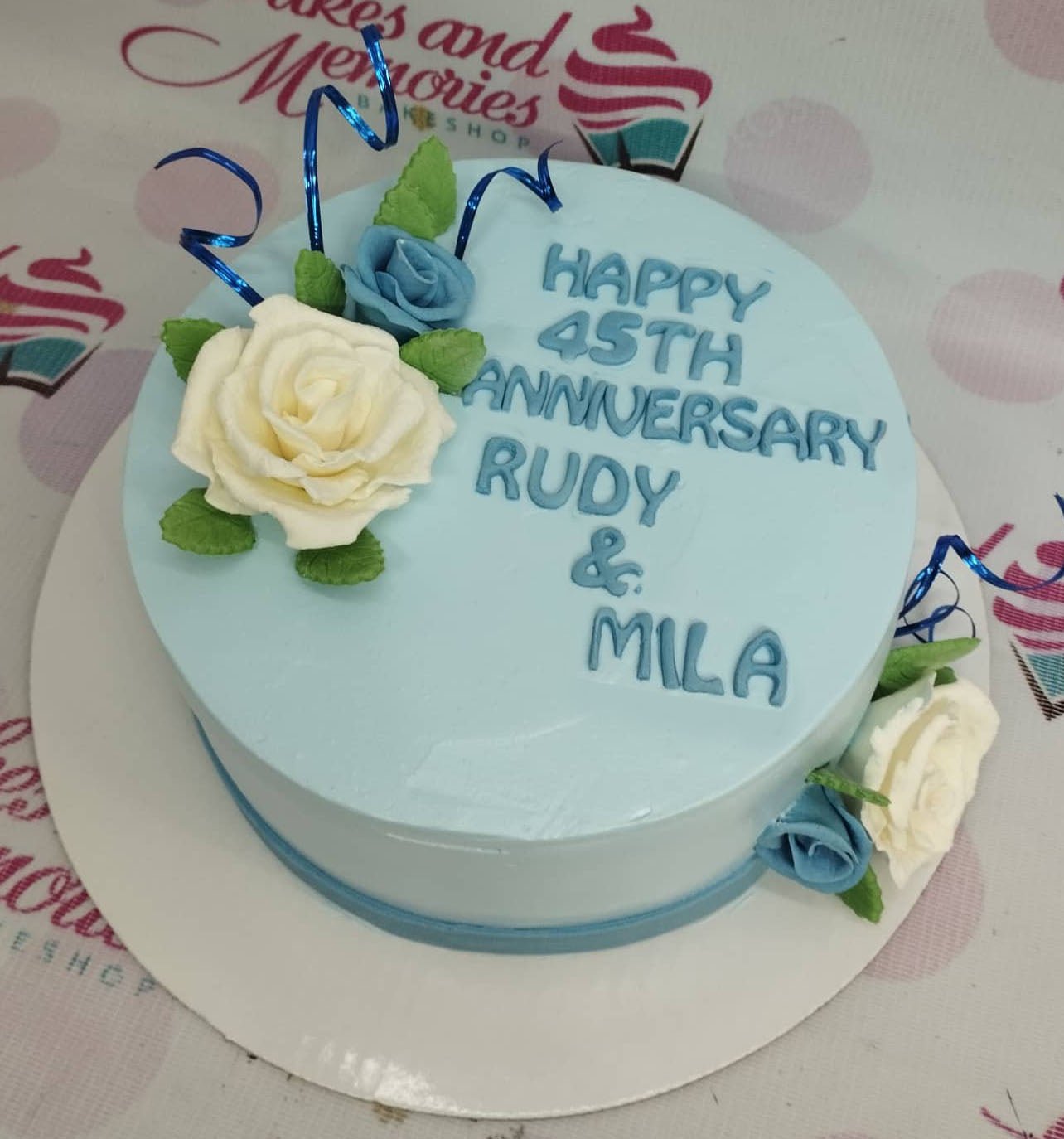 Light blue anniversary cake with white and blue gumpaste roses and blue metallic swirls for Rudy and Mila's 45th anniversary.