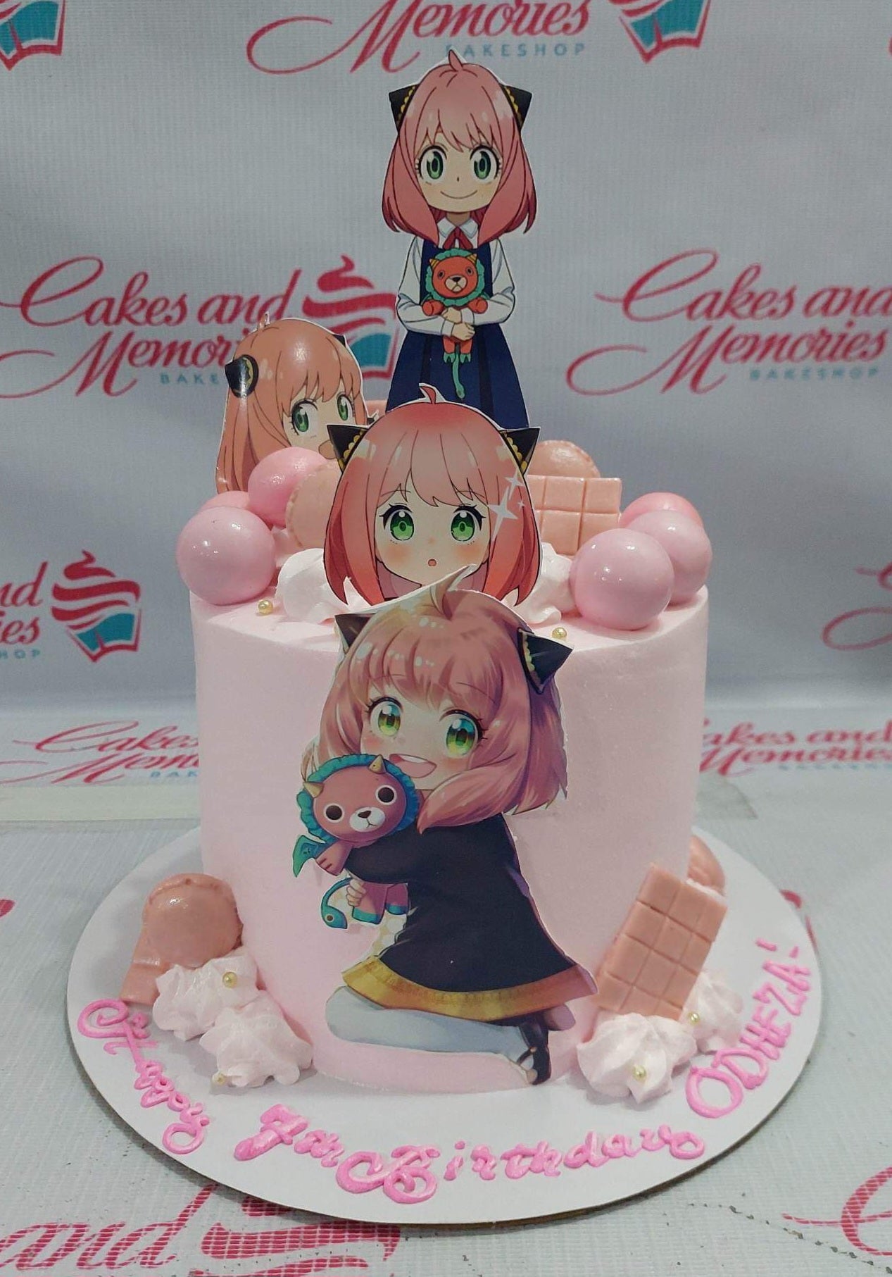 Pink Anya Forger Spy x Family birthday cake with character printouts, pink chocolate bars, and macarons.