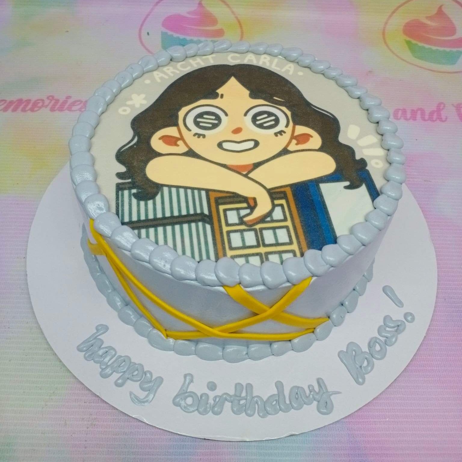 Light blue 1-tier birthday cake with a large character printout of a girl architect and yellow icing crisscross patterns.