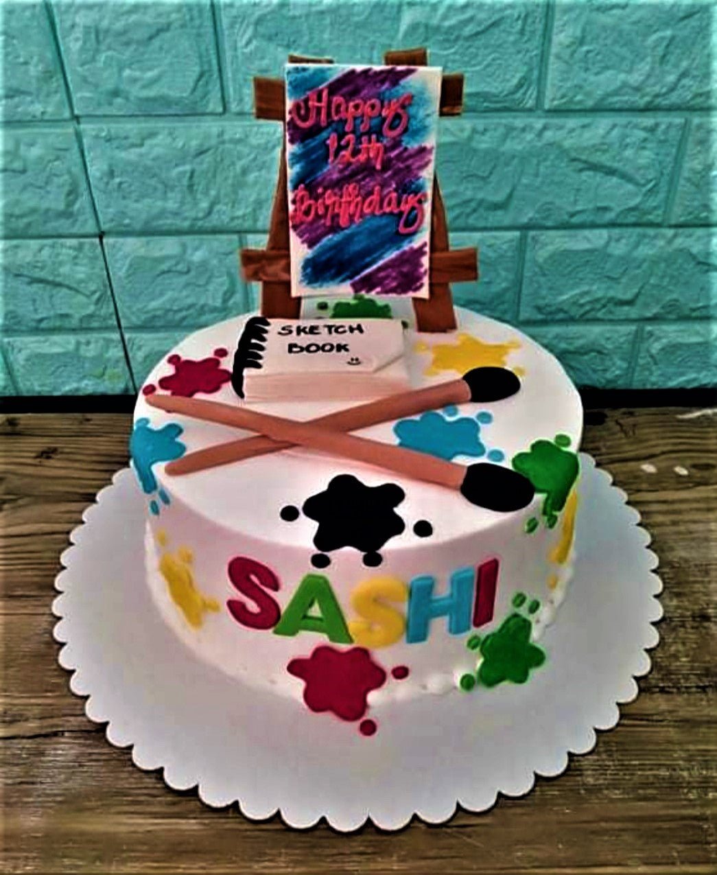 Artistic 12th birthday cake with an easel topper, sketch book, paint brushes, and colorful paint splatters on white icing.