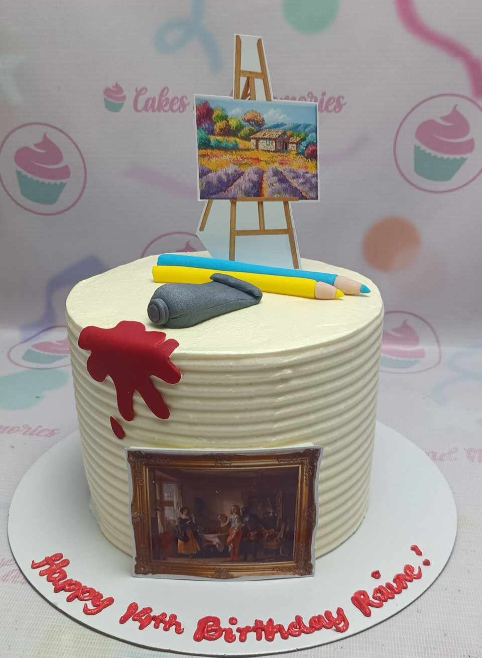 White 1-tier artist themed birthday cake with an easel topper, fondant paint tubes, and pencils.