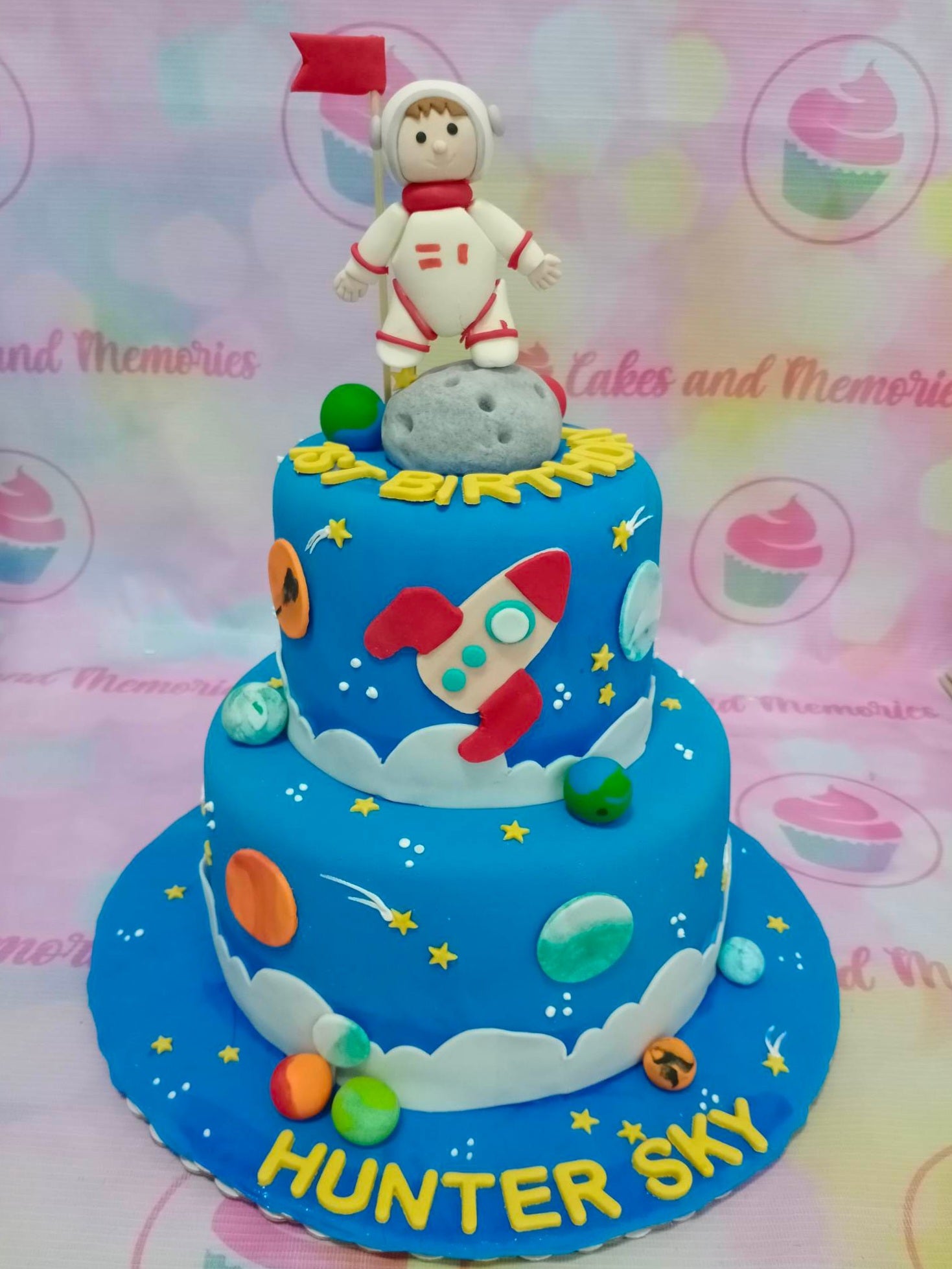 Two-tier blue space-themed fondant cake with an astronaut figure, rocket, planets, and stars.